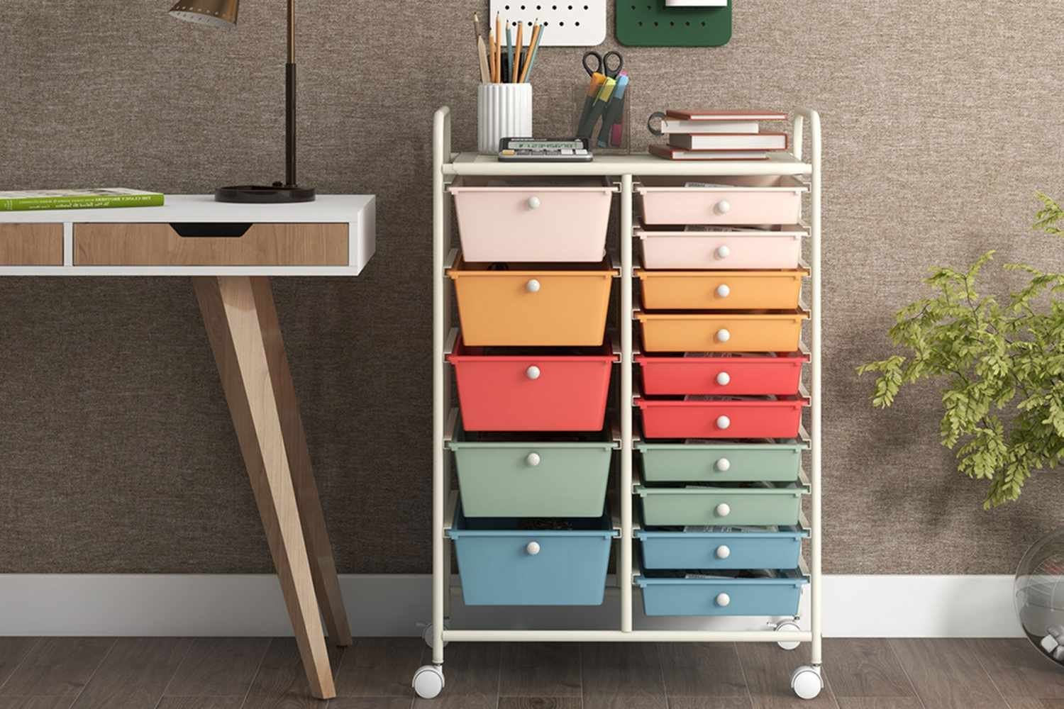 Whether you want a convenient spot to store craft supplies, to declutter a playroom, or organize an office, this 15-drawer rolling chest is a smart pick. Thanks to its locking wheels, the chest can be conveniently rolled wherever you need it. It also has a roomy surface tabletop that can be used as extra storage or a workspace. One reviewer said the “convenient” chest “provides plenty of storage.”