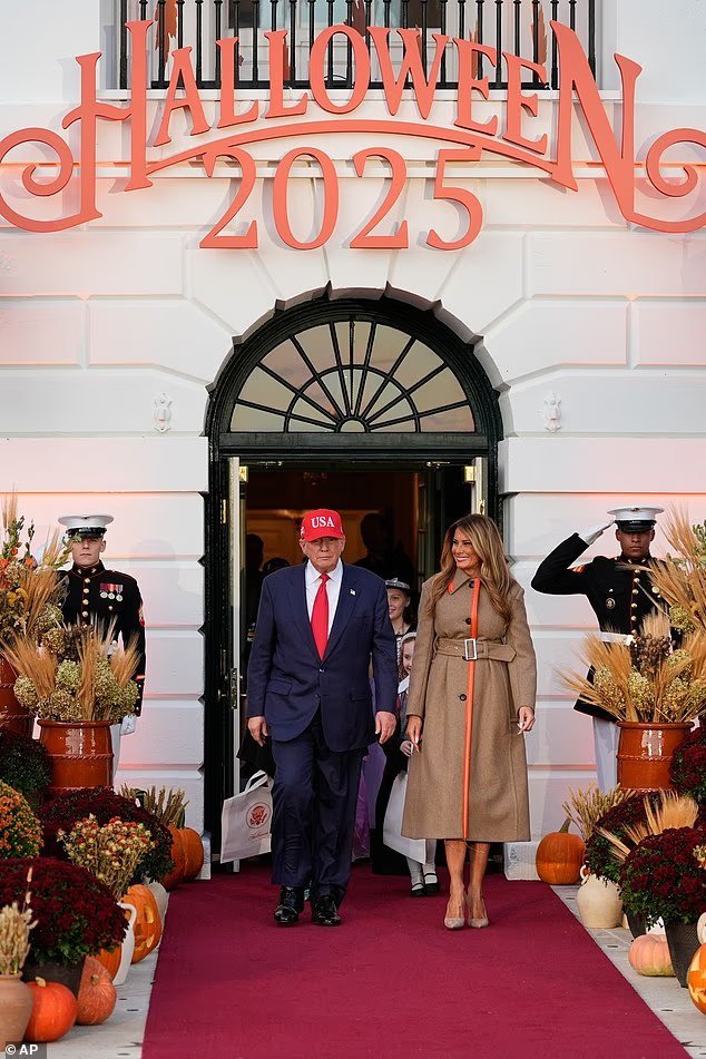Melania’s chic look was a far cry from the campy panda bear costume that Jill Biden wore to last year’s Halloween celebration