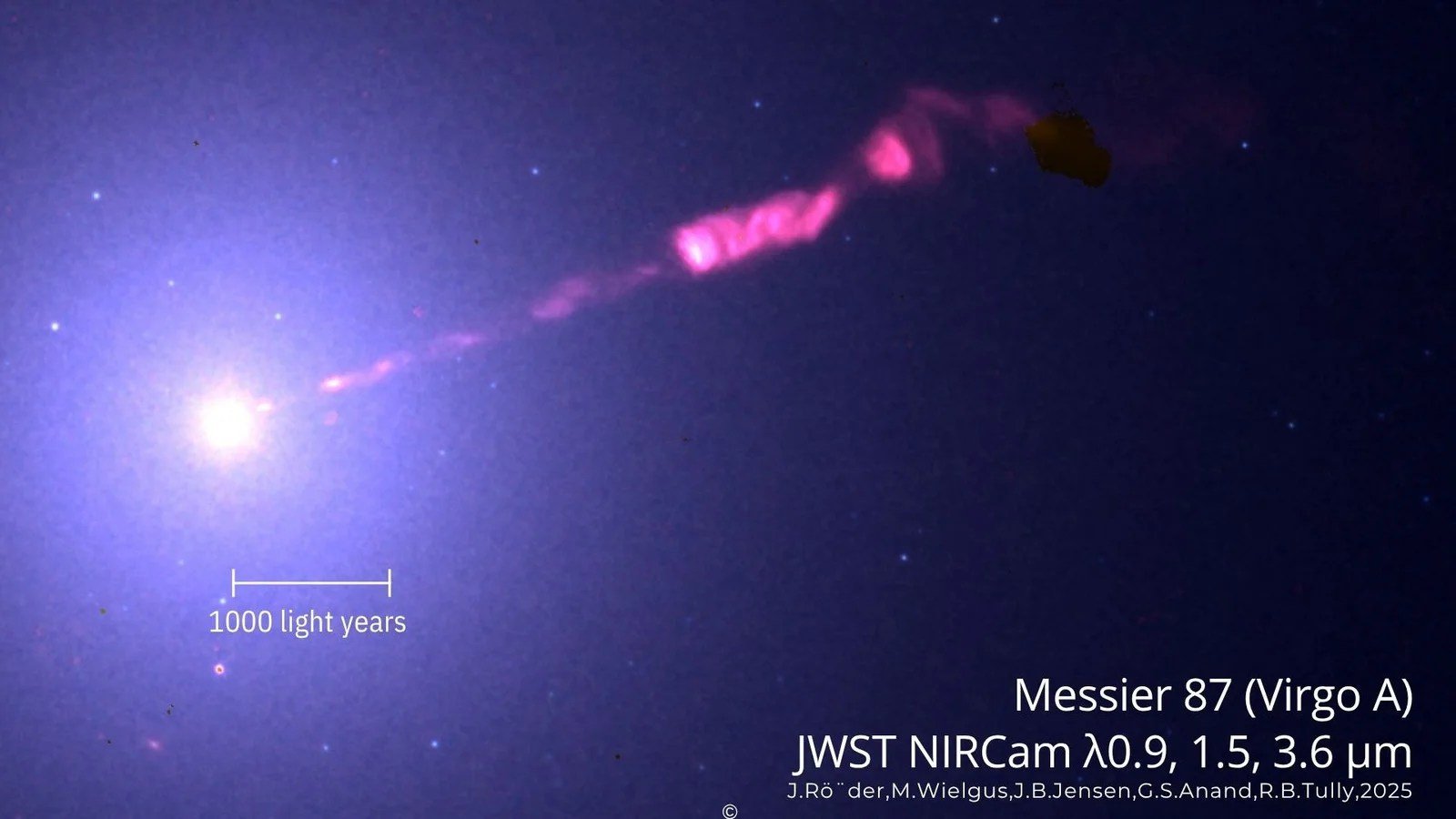 In the new JWST image, the jet appears as a luminous pink ribbon unfurling across a hazy violet backdrop. The stream of charged particles shoots a few thousand light-years from M87’s central black hole. Bright knots glow along its length, tracing where particles are accelerated to near-light speeds.