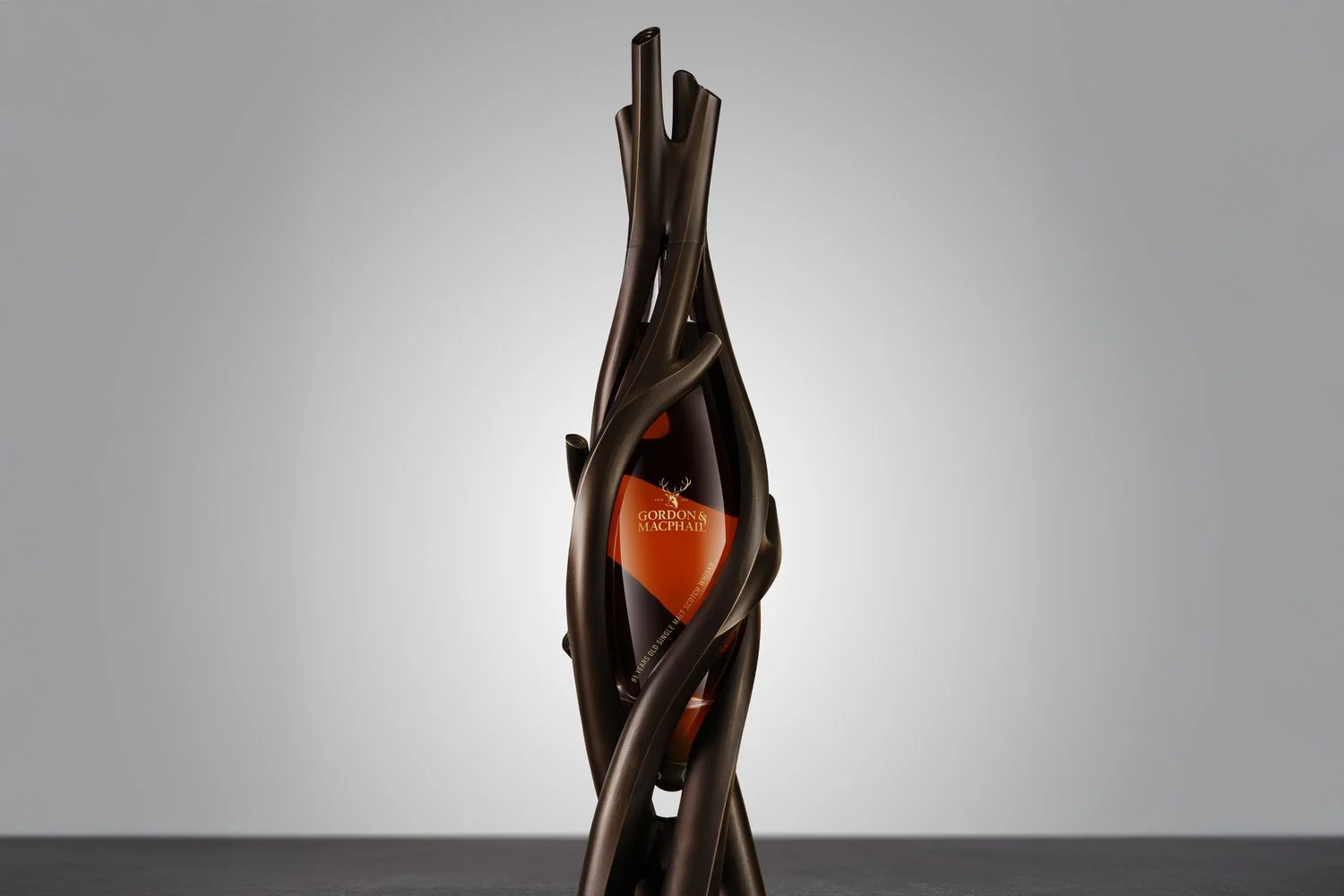 To design the whisky’s packaging, Gordon & MacPhail enlisted American architect Jeanne Gangwhose projects include the Aqua Tower in Chicago and Bill Clinton’s presidential library in Arkansas. Evoking the Artistry In Oak theme, the hand-blown glass decanter is entwined and protected by four cast bronze “branches.”