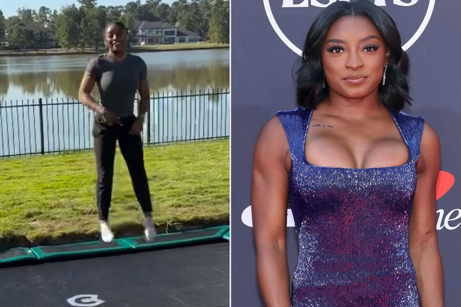 Although she didn’t give much context to her caption, Biles narrated the video as she performed several backflips on a massive trampoline she had embedded within the grass adjacent to a lake in her home’s backyard.