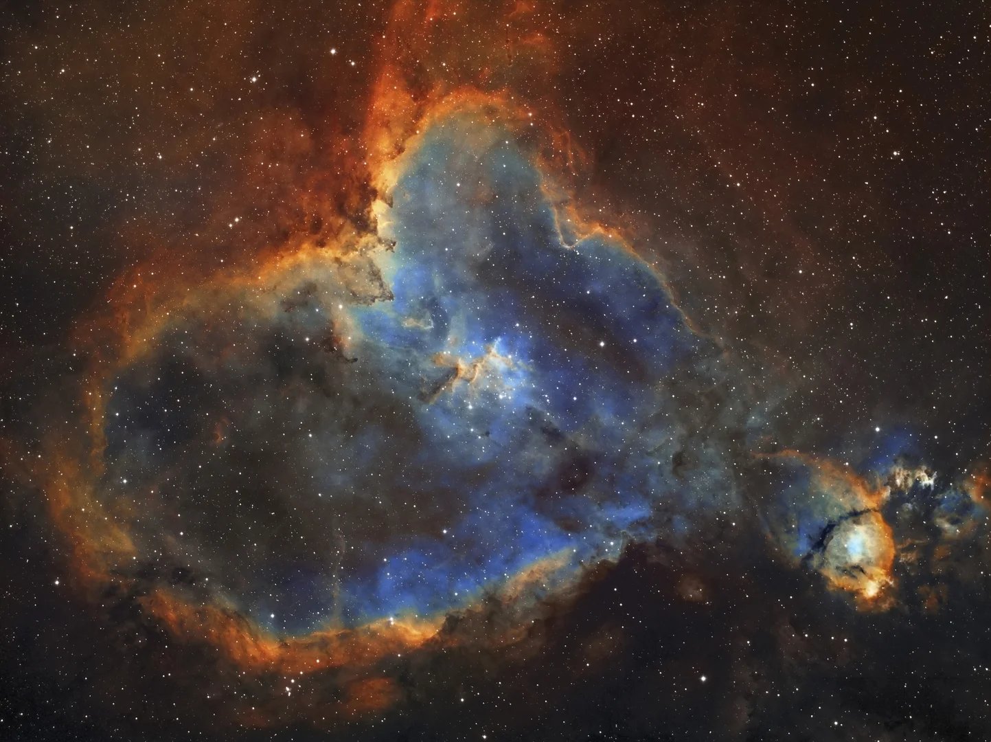 The Heart Nebula is a massive star formation region, and it was given this name because of its resemblance to the human heart. The center of the nebula includes a group of young, active stars whose rays carve the depths of the dense dust. It can be found only 5 degrees away from the bright star Segin in the constellation Cassiopeia. It can be spotted high above the northern horizon around midnight in October.